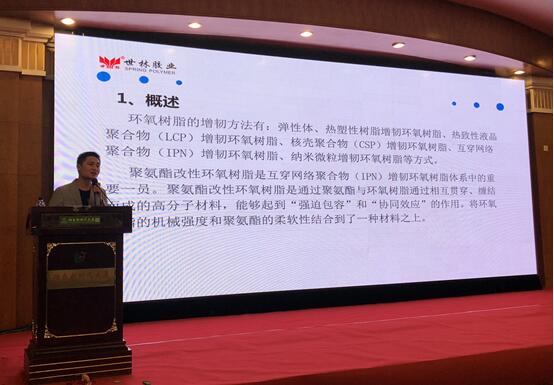 世林膠業(yè)劉工在環(huán)氧應(yīng)用技術(shù)學術(shù)交流會上進行《聚氨酯改性環(huán)氧樹脂對環(huán)氧樹脂性能影響的研究》的演講。