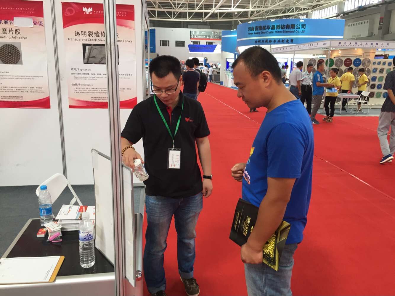 世林膠業(yè)是一家專業(yè)研制和生產(chǎn)各種石材膠和磨具磨料專用膠的廠家,其產(chǎn)品具有強(qiáng)度高、耐黃變、耐老化、收縮小、滲透強(qiáng)等特點(diǎn),主要應(yīng)用在臺板復(fù)邊、拼花、裂縫修補(bǔ)、磨具磨料上。很多客商對我們世林全透明石材膠系列非常感興趣,完全透明清澈如水的液體適合對各種顏色的石材進(jìn)行修補(bǔ),滲透性強(qiáng)的特性又能有效的修復(fù)裂縫、小孔洞、砂眼、螞蟻路孔洞等現(xiàn)象。展會上很多客商當(dāng)場就向我們訂購全透明石材膠,包括我們展會上的石材膠樣品都被客戶買回去做測試。